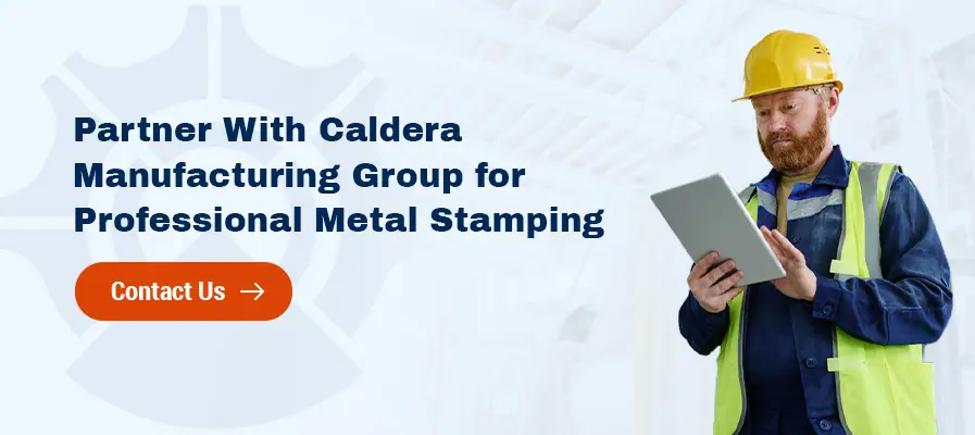 At Caldera Manufacturing Group, we provide customized metal stamping solutions for various industries. With our state-of-the-art equipment, skilled technicians and commitment to quality, we can help you bring your metal component designs to life. Our expertise in various metal stamping techniques allows us to tailor our services to meet your needs, ensuring we produce your parts with the highest levels of precision and reliability. We are ISO 9001:2015 certified and an AWS Certified Welder.