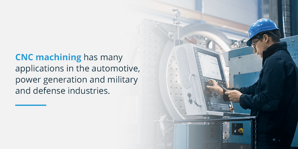 CNC machining has many applications in the automotive, power generation and military and defense industries.