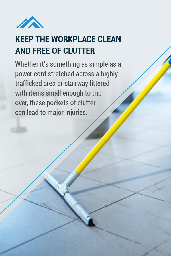 Maintaining a clean workplace is such a basic concept that it may seem to be beneath our mentioning, yet its effect on your workplace safety is so profound that it’s worth mentioning anyway. Whether it’s something as simple as a power cord stretched across a highly trafficked area or stairway littered with items small enough to trip over, these pockets of clutter can lead to major injuries. For this reason, it’s crucial to remove them.