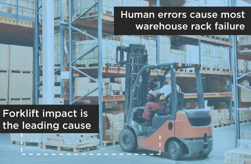 Warehouse rack failures are almost always caused by human errors. It’s nearly unheard of for a properly designed rack system to fail on its own, provided you go with a reputable manufacturer using quality materials and assembly techniques. Most failures result from incidents occurring in the warehouse environment. Some examples of the incidents that might occur include: