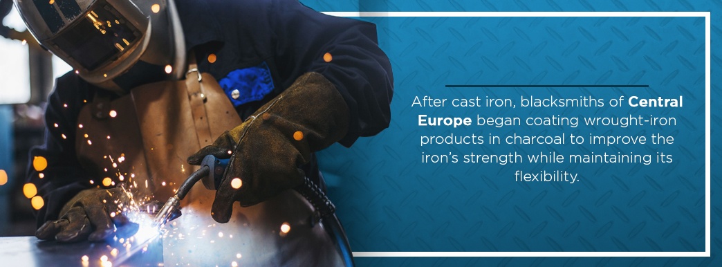 Steel is a discovery of the Iron Age, a period that started around 1200 BCE. Iron ore was first mined in Central Asia and Europe, and humans at this time used iron to make tools and weapons in a practice called ferrous metallurgy. Iron products evolved during this time, beginning with blacksmiths producing wrought iron goods. These tradespeople learned to heat up iron ore, and using a hammer-and-anvil process, the blacksmiths would remove impurities from the metal and produce a durable and malleable final iron product.
