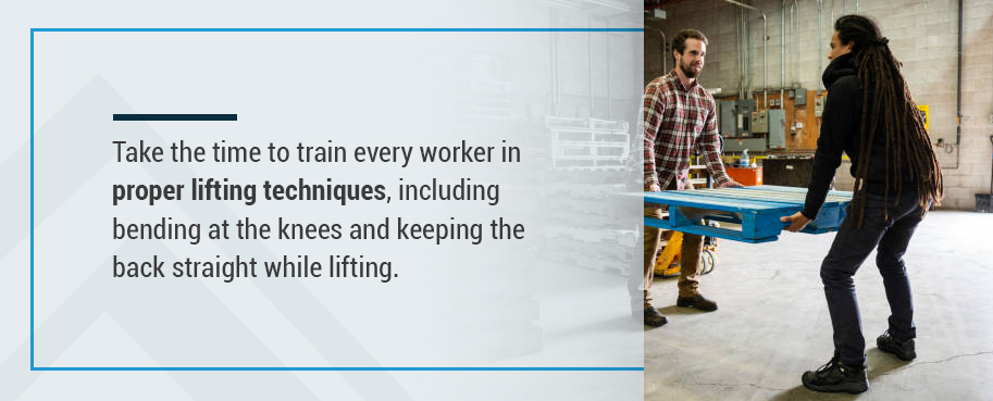 Take the time to train every worker in proper lifting techniques, including bending at the knees and keeping the back straight while lifting. Post signs around the warehouse to remind workers of these lifting procedures. If you feel it’s necessary, you might even host periodic training sessions to keep these techniques fresh in your employee’s minds.