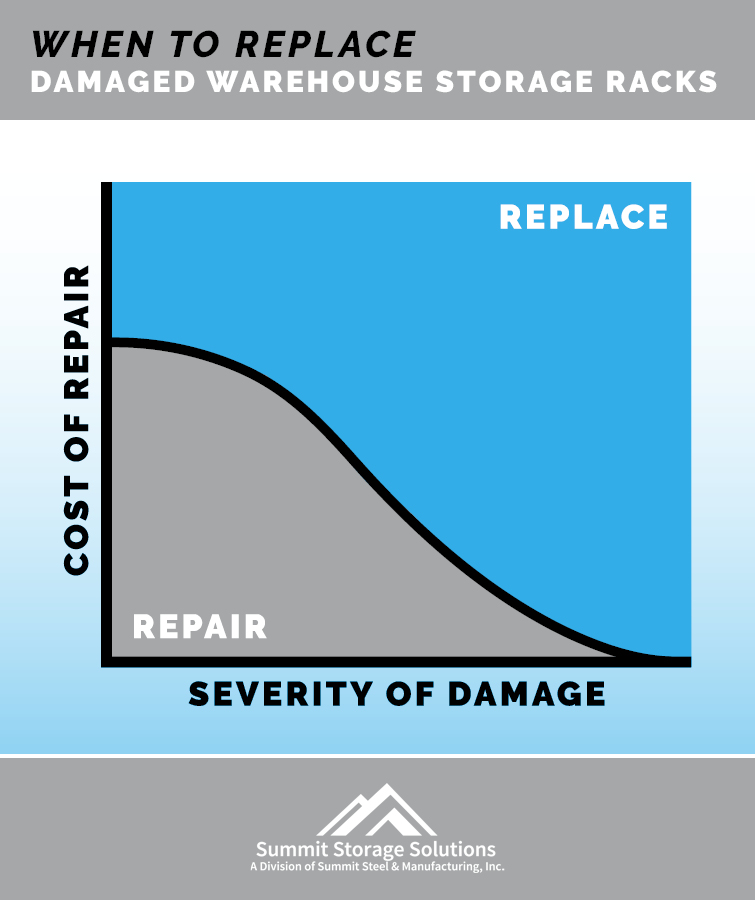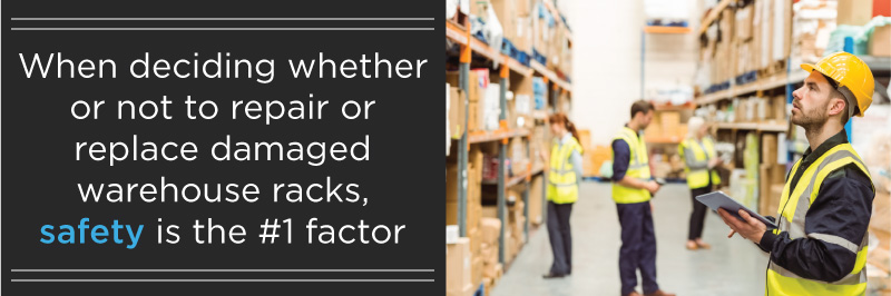 Safety should be the primary factor when deciding whether to repair or replace damaged warehouse racks. One major mishap in a rack collapse could mean thousands of lost dollars, not counting the expense of treating injured workers or suffering through a lengthy legal litigation.
